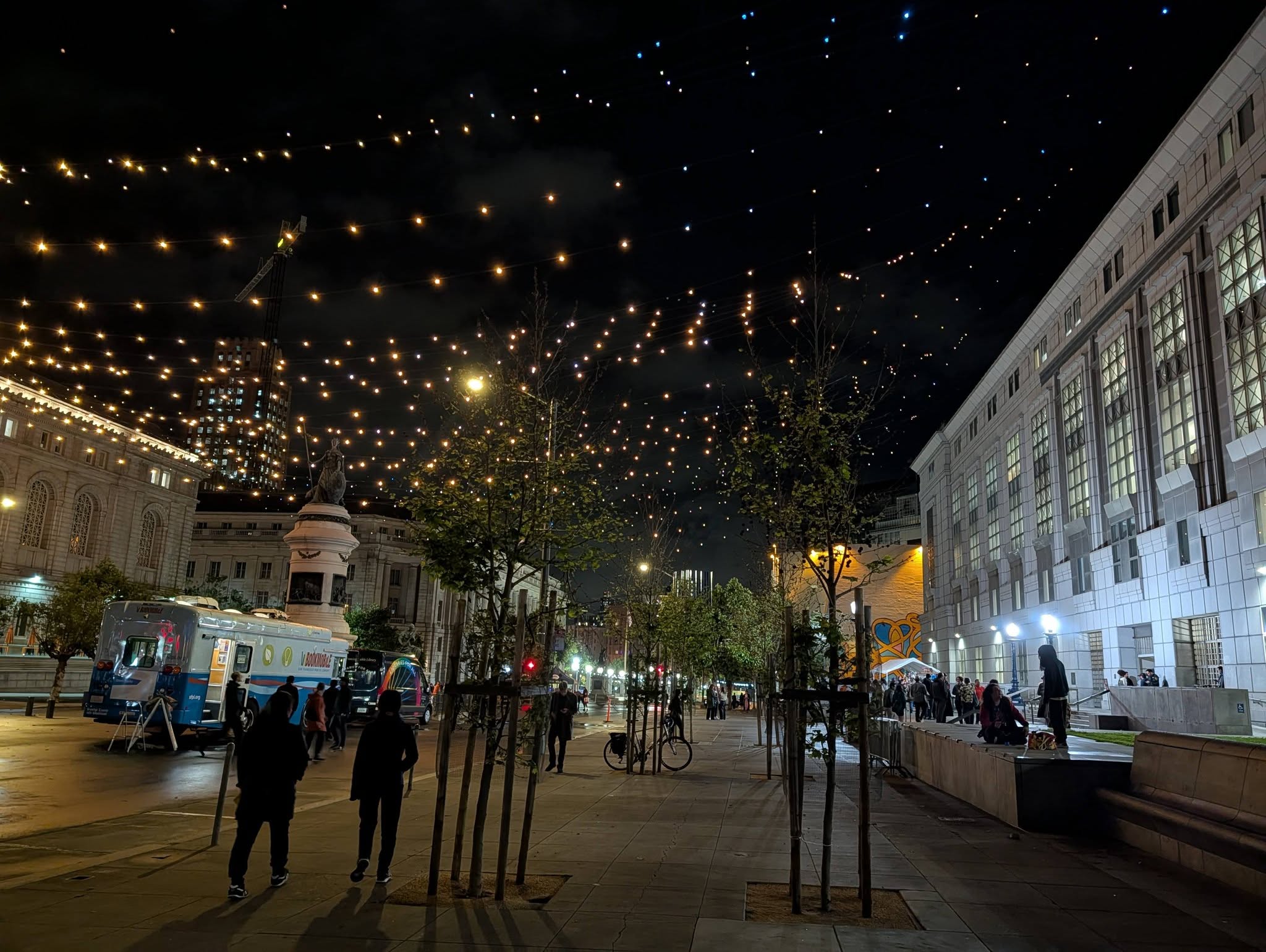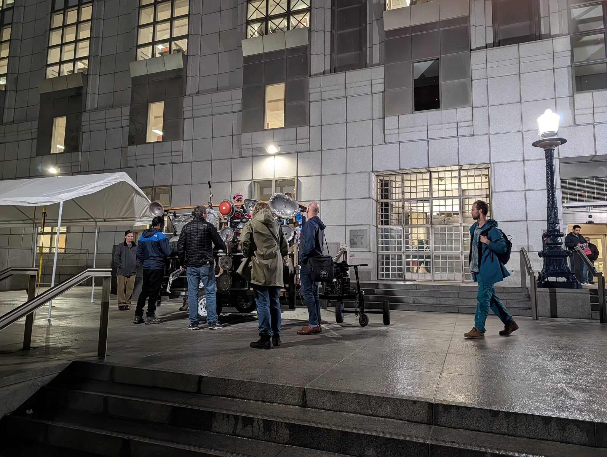 The SFPL with lights and food trucks and seatingThe mobile gamelan which I had seen at various parades in the past, makes an appearance at the SFPL for people to bang on and make music